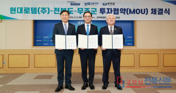 | ↑↑ 3일 전북특별자치도청 회의실에서 무주군 일원에 항공우주 생산기지를 조성하는 현대로템㈜ 투자협약식에 김관영 도지사와 이용배 대표이사, 황인홍 무주군수등 참석자들이 협약식을 갖고 있다 |