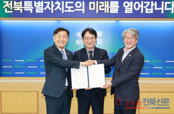 | ↑↑ 3일 전북특별자치도청 회의실에서 열린 전북 문화예술 및 관광브랜드 발전을 위한 (사)문화강국네트워크 업무협약식에 김관영 도지사와 이우종 (사)문화강국네트워크 이사장, 이경윤 문화관광재단 대표이사가 협약식을 갖고 있다 |