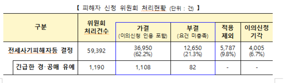 가결된 501건 중 478건은 신규 신청(재신청 포함) 건이고, 23건은 기존 결정에 이의신청을 제기하여 「전세사기피해자법」 제3조에 따른 전세사기피해자의 요건 충족 여부가 추가로 확인되면서 전세사기피해자 및 피해자등으로 결정됐다.