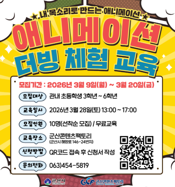 [굿모닝전북신문=한영희기자] 전북 군산콘텐츠팩토리가 초등학생을 대상으로 ‘애니메이션 더빙 체험’ 교육을 3월 28일 운영하며, 참가자 10명을 선착순 모집한다.