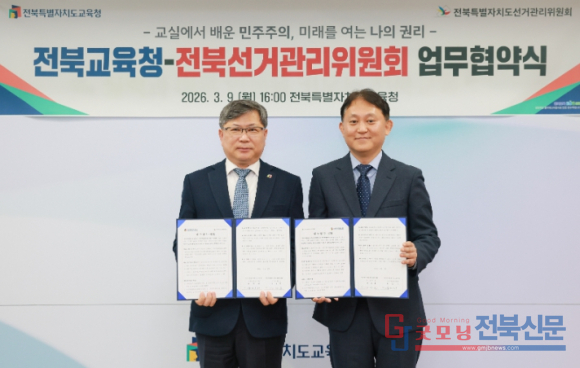 유정기 교육감 권한대행과 경범훈 전북선관위 사무처장은 9일 도교육청 5층 회의실에서 양 기관 관계자 10여 명이 참여한 가운데 ‘주권자시민교육 활성화를 위한 업무협약’을 체결했다.