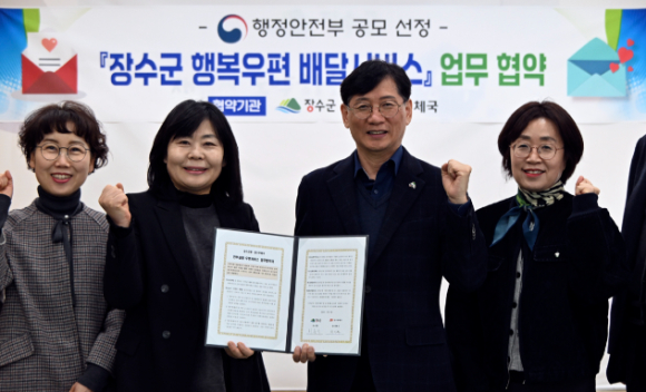 장수군은 이번 사업의 성공적인 추진을 위해 장수우체국과 협력체계를 구축하는 업무협약도 함께 체결하고, 복지 사각지대에 놓인 취약계층을 보다 촘촘하게 돌보기 위한 민‧관 협력 기반을 강화했다.