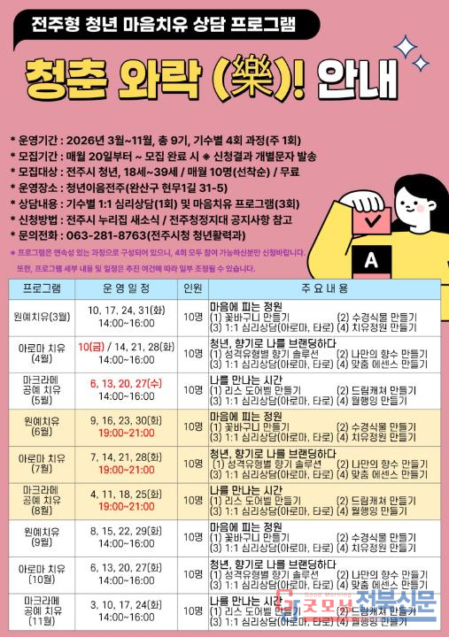 | ↑↑ 전주시 청년 마음 치유 돕는 `청춘와락(樂)` 운영 본격화 |