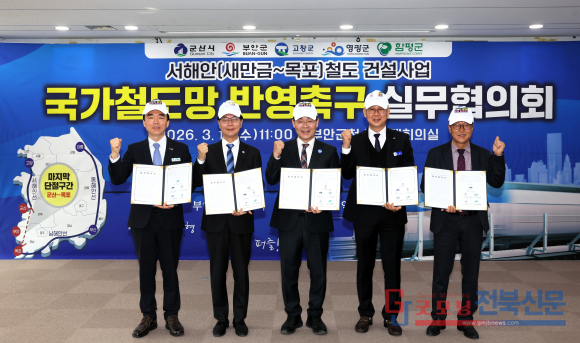 [굿모닝전북신문=최진수기자] 서해안 철도 건설사업을 국가계획에 반영시키기 위한 서해안권 지방자치단체들의 공조가 다시 한번 속도를 내고 있다. 전북특별자치도 부안군을 비롯한 군산시·고창군·영광군·함평군 등 5개 시군은 11일 부안에서 실무협의회와 공동협약식을 잇따라 열고, 서해안 철도 건설의 필요성을 재확인하는 한편 중앙정부와 국회를 향한 공동 대응 체계를 본격화했다.