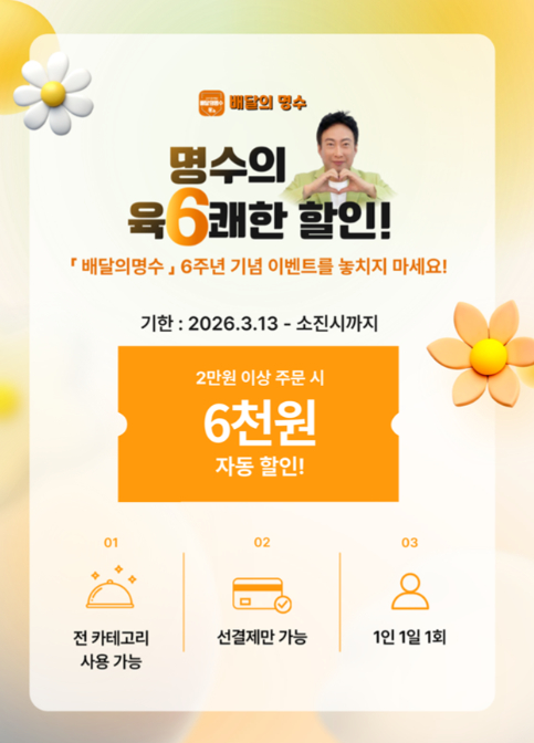 이번 이벤트는 배달의명수 이용 소비자를 대상으로 진행되며, 이벤트 기간 동안 2만 원 이상 주문 시 6,000원을 즉시 할인받을 수 있다. 할인은 하루 1회 한정으로 제공되며 선결제 주문에 한해 참여 가능하다.