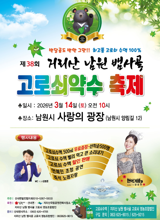 [굿모닝전북신문=한영희기자] 2026년 새봄을 맞이해 38번째 지리산 뱀사골 고로쇠 약수축제가 오는 3월 14일(토) 오전 10시 남원시 사랑의 광장 일원에서 개최된다.