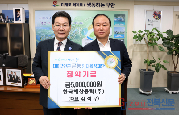 한국해상풍력주식회사(대표 김석무)는 최근 부안군 근농인재육성재단에 지역 인재 육성을 위한 장학금 500만원을 기탁했다고 밝혔다. 이번 장학금은 지역 학생들의 안정적인 학업 여건 조성과 미래 인재 양성을 지원하기 위한 뜻에서 마련됐다.