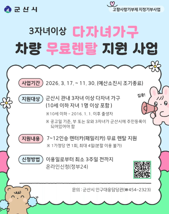 [굿모닝전북신문=한영희기자] 군산시가 3자녀 이상 다자녀 가구의 이동 편의를 돕고 가족 단위 여가 활동을 장려하기 위해 '3자녀 이상 다자녀 가구 차량 무료 렌탈 지원 사업'을 17일부터 본격 시행한다고 밝혔다.