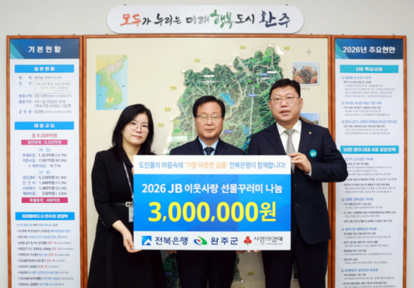 16일 전북은행은 완주군청 군수실에서 조인성 부행장과 김성두 완주군청지점장 등이 참석한 가운데 유희태 완주군수에게 ‘2026 JB이웃사랑 선물꾸러미’를 전달했다. 이번 기탁은 지속되는 물가 상승으로 생활고를 겪는 관내 저소득 가정을 실질적으로 돕고자 전북은행 측에서 마련했다.