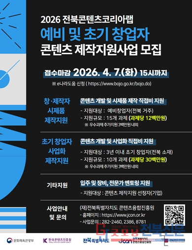 전북콘텐츠코리아랩은 지역 기반의 지속 가능한 콘텐츠 창·제작 생태계 조성과 활성화를 위해 운영되고 있으며, 도내 콘텐츠 창작자와 초기 창업기업의 창작 활동 및 사업화를 지원하고 있다. 이번 제작지원사업은 통합 공고 형태로 진행되며, ▲ 예비 창업자 시제품 제작지원, ▲ 초기 창업기업 사업화 지원 등 두 개 분야로 구분해 추진한다.