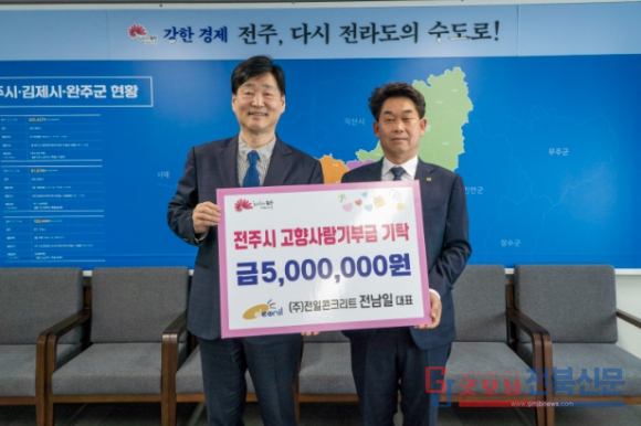 전남일 ㈜전일콘크리트 대표는 20일 전주 부시장실을 방문해 마음의 고향인 전주를 응원하는 마음을 담은 고향사랑기부금 500만 원을 기부했다.