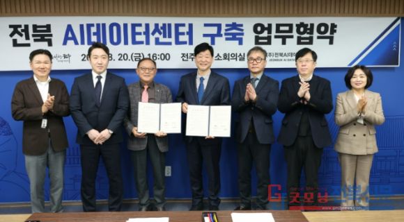 전주시와 ㈜전북에이아이데이터센터는 20일 시청 3층 소회의실에서 윤동욱 전주시장 권한대행 부시장과 이정천 ㈜JBAIDC 회장을 비롯한 ㈜KT 전남전북광역본부, 한국마이크로소프트(유) 등 컨소시엄 업체 관계자들이 참석한 가운데 ‘전북 AI데이터센터 구축 및 운영 업무협약’을 체결했다.