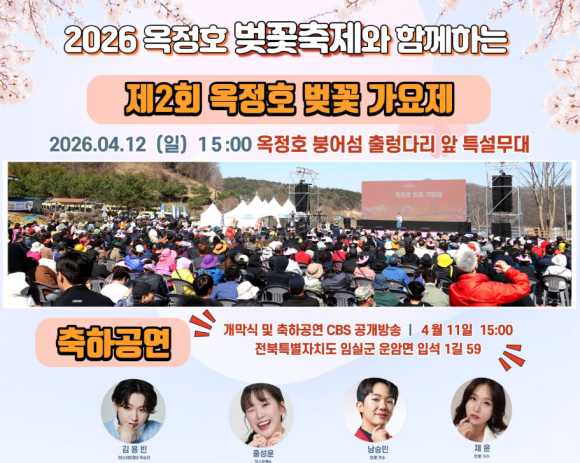 이번 가요제는 벚꽃이 만개한 옥정호 붕어섬에서 열리는 “2026 옥정호 벚꽃축제”의 대미를 장식하는 대표프로그램으로 축제의 열기를 최고조로 끌어올릴 예정이다.