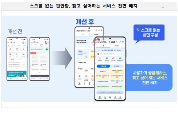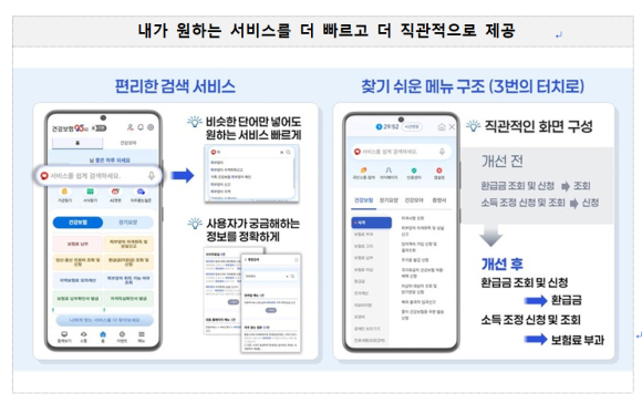 - 기존의 ‘조회’, ‘신청’ 등 나열식 기능 구조에서 벗어나, ‘자격’, ‘보험료 납부’ 등 민원 서비스 종류와 이용 목적 중심으로 메뉴를 직관적으로 재구성했다.