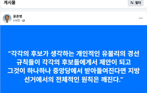 윤 위원장은 페이스북에서 “각각의 후보가 생각하는 개인적인 유불리의 경선 규칙들이 각각의 후보들에게서 제안이 되고, 그것이 하나하나 중앙당에서 받아들여진다면 지방선거에서의 전체적인 원칙은 깨진다”고 일갈했다.