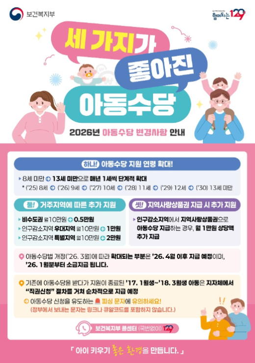 아동수당 지급 연령 확대에 따라, 2017년 1월생부터 2018년 3월생 아동에 대해 문자메시지와 우편물 발송을 통해 관련 내용을 안내하고, 보호자의 동의를 받아 2026년 미지급분을 소급 지급할 계획이며, 보호자 동의 방법은 거주지 읍면동 행정복지센터에 연락하면 된다.