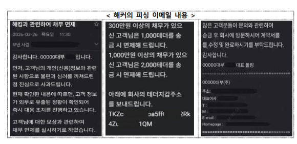 해커는 침해사고 보상과 관련하여 코인을 전송하면 채무를 면제해 주겠다는 대부업체 명의의 이메일을 발송하고 있다고 한다.