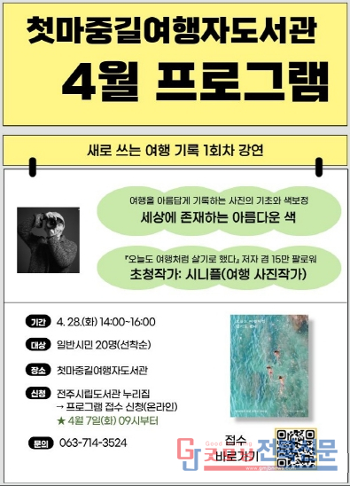 첫마중길여행자도서관은 전주 여행의 시작을 함께하고자 다양한 강연·공연·체험·큐레이션 등을 운영하고 있으며, 특히 올해는 여행을 기록하는 방법을 시민들에게 알리기 위해 초청 강연 형식의 ‘새로 쓰는 여행 기록’이라는 새로운 프로그램을 기획했다.