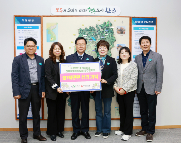 이날 행사에는 태치옥 완주군지회장을 비롯해 이설로 자문위원장, 장동익 삼례분회장 등 관계자들이 참석해 온정을 나눴다. 이번에 기부한 성금 100만 원은 관내 취약계층을 위한 복지 사업에 소중히 사용할 계획이다.