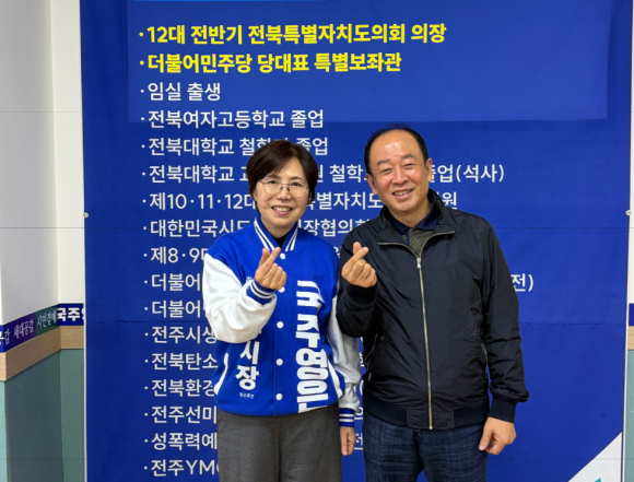 [굿모닝전북신문=한영희기자] 임정엽 전 완주군수와 국주영은 더불어민주당 전주시장 예비후보가 4일 국 후보 사무실에서 만나, 전주 현안에 대해 장시간에 걸친 심도 있는 논의를 진행했다.