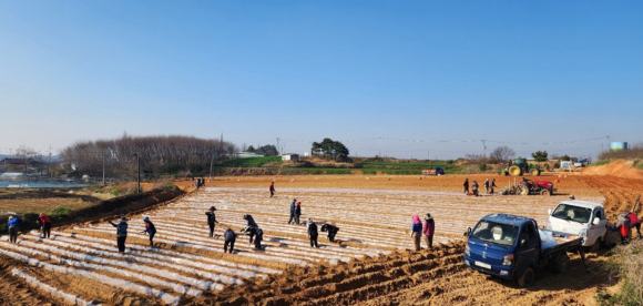 시는 이날 승북영농조합법인(대표 이경환) 농가에서 고구마 무병묘를 활용한 조기 재배 방식으로 정식을 마쳤다. 특히 두둑 만들기부터 비닐 피복, 정식, 약제 살포까지 전 과정을 기계화해 작업 효율을 크게 높인 것이 특징이다.