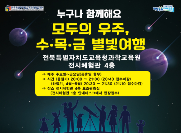[굿모닝전북신문=한영희기자] 전북특별자치도교육청과학교육원(원장 강진순, 이하 과학교육원)은 4월 과학의 달과 봄을 맞이해 도민들에게 밤하늘의 신비로움을 선사하고자 ‘봄철 별자리와 함께하는 수·목·금 별빛여행’을 운영한다.