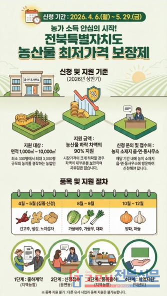 김신중 전북자치도 농생명정책과장은 “기후변화와 소비 위축으로 농산물 가격 불안정이 지속되는 상황에서 최저가격 보장제는 농민들이 안심하고 생산에 전념할 수 있도록 하는 핵심 제도”라며 “신청 기간을 놓쳐 지원에서 제외되는 일이 없도록 적극적인 참여를 당부한다”고 말했다