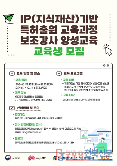 시와 전주정보문화산업진흥원(원장 허전, 이하 진흥원)은 지난해에 이어 올해도 전주 교육발전특구 사업의 일환으로 IP 기반, 미래사회 인재 육성을 위해 중장년 및 경력단절 여성 등을 대상으로 ‘IP(지식재산)기반 특허출원 교육과정’ 보조강사 양성교육을 시행한다고 6일 밝혔다.