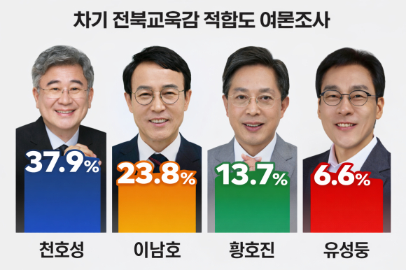 이 중 응답자의 37.9%가 천호성 전 위원 지지, 23.8%가 이남호 전 전북대 총장을 지지한다고 응답했다. 황호진 전 전북교육청 부교육감이 13.7%, 유성동 현 좋은교육시민연대 대표는 6.6%의 지지율을 얻었다.
