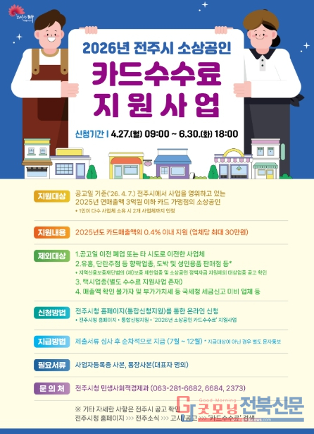 시는 오는 27일 09시부터 6월 30일 18시까지 전주시 소상공인을 대상으로 2025년도 카드매출액의 0.4% 이내, 업체당 최대 30만 원까지 지원하는 ‘2026년 소상공인 카드수수료 지원사업’ 신청을 접수한다.